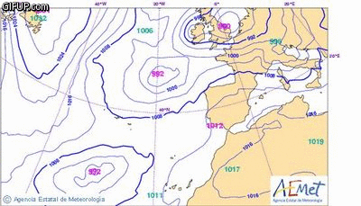 Esta es una animación extraída de la Agencia Estatal de Meteorología. El choque de la tormenta con Galicia se producirá en la madrugada del sábado al domingo (aproximadamente a la 1:00 am).