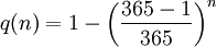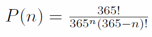 Por lo tanto la probabilidad de que haya una coincidencia es de 1-0,493 = 0,507, tal y como decíamos al principio de la entrada. La ecuación se puede generalizar para cualquier grupo n de personas de la siguiente forma: