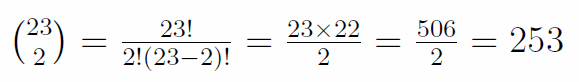 Pero es que en realidad de lo que estamos hablando es que dos personas cualesquiera de esas 23 compartan cumpleaños… y si bien sólo hay 23 personas, posibles parejas entre esas 23 personas son bastantes más. La combinatoria dice que el número de posibilidades de coger n elementos en grupos de k (sin repeticiones) es:
