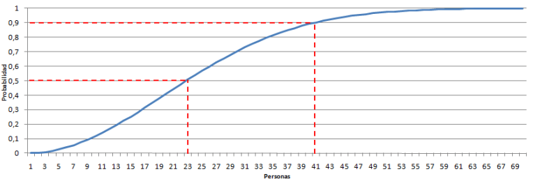 Recuerda que es la probabilidad de NO coincidencia, y la probabilidad de coincidencia se calcula como 1-P(n). Poniendo estos cálculos en la hoja de cálculo obtenemos esta bonita gráfica en la que vemos que la probabilidad para 23 personas ronda el 50% y para 41 sube hasta el 90%. Sorprendente ¿no?