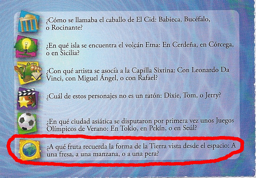 Este fin de semana jugando con los peques a un Trivial versión infantil nos encontramos con la siguiente pregunta: ¿A que fruta recuerda la forma de La Tierra vista desde el espacio?