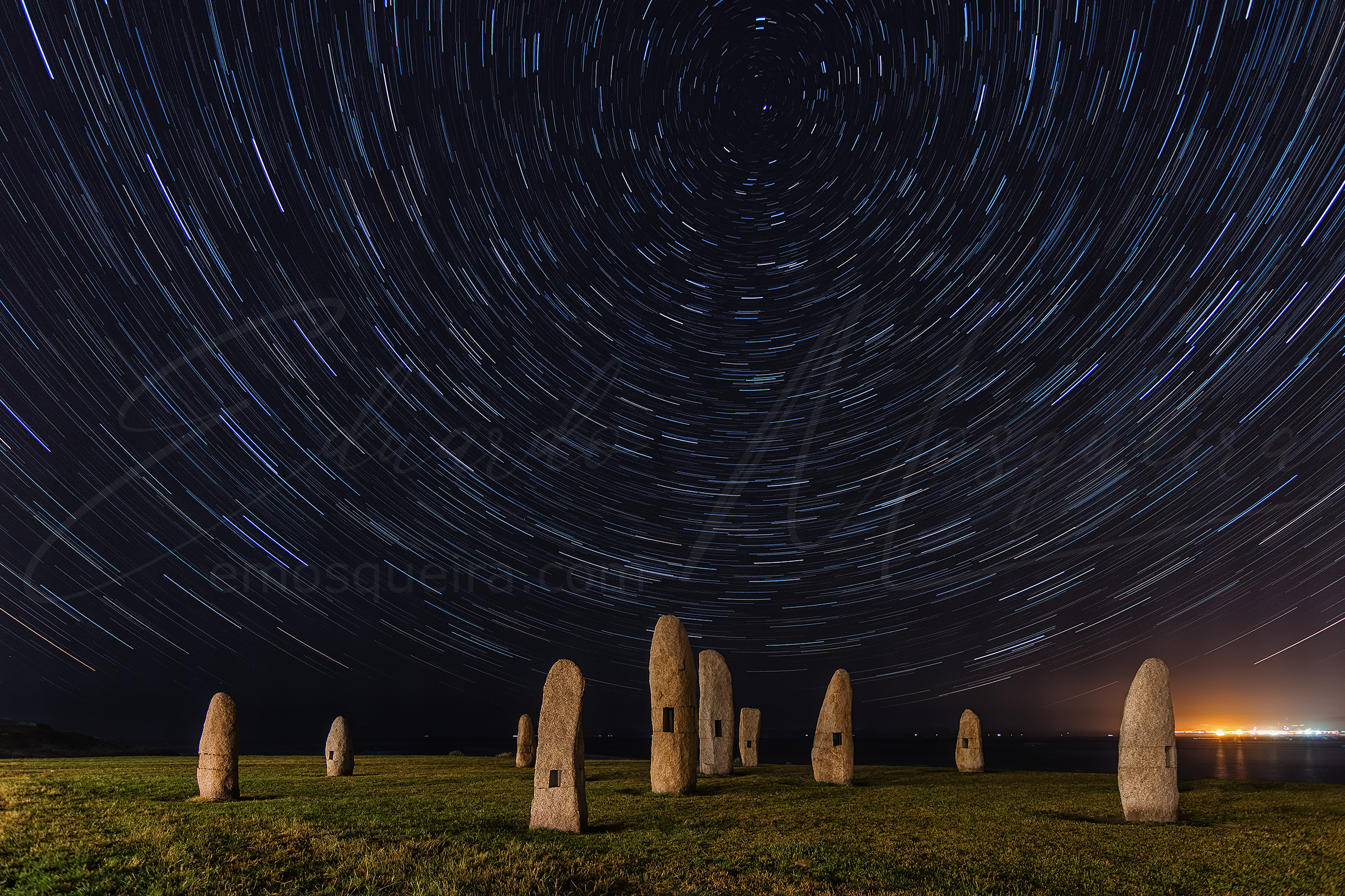 Cerca de la Torre de Hércules existe una extensión de terreno denominada «Campo da Rata» donde, lamentablemente, tras el triunfo de la sublevación militar de julio de 1936 los sublevados lo utilizaron como campo de fusilamiento de las personas apresadas y contrarias a la sublevación. En el Campo de la Rata existe desde 2003 una obra escultórica, realizado por Manolo Paz, denominada «Menhires por la Paz». Aprovechando la noche despejada de ese día aproveché para hacer una traza de estrellas o star trail que consiste básicamente en apilar muchas fotografías (en este caso 84) dejando la cámara fija. A medida que La Tierra va rotando las estrellas se van moviendo por el cielo dejando las características trazas. Todas salvo una la Estrella Polar, cuyo movimiento es prácticamente imperceptible. La foto fue escogida para formar parte del Calendario Municipal de A Coruña en su edición de 2020.
