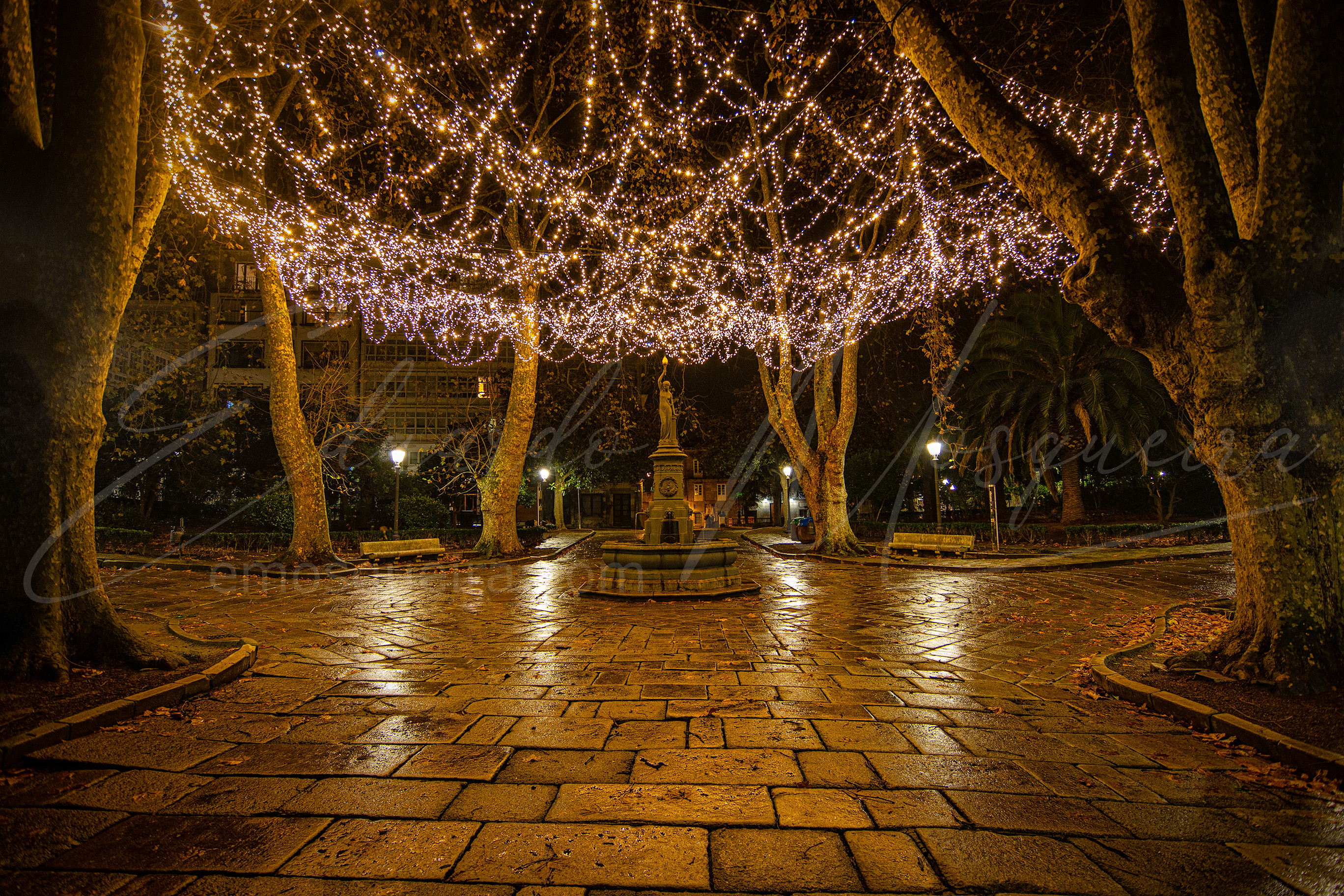 Foto escogida para formar parte del Calendario Municipal de A Coruña en su edición de 2023, concretamente el mes de diciembre. La Plaza de Azcárraga es un sitio mágico de la ciudad, una de esas plazas antiguas con árboles centenarios una fuente de los deseos en el centro. Si le añades iluminación navideña y vas un día de lluvia buscando reflejos en el suelo obtienes una estampa mágica que se ve magnificada por el uso de un gran angular.