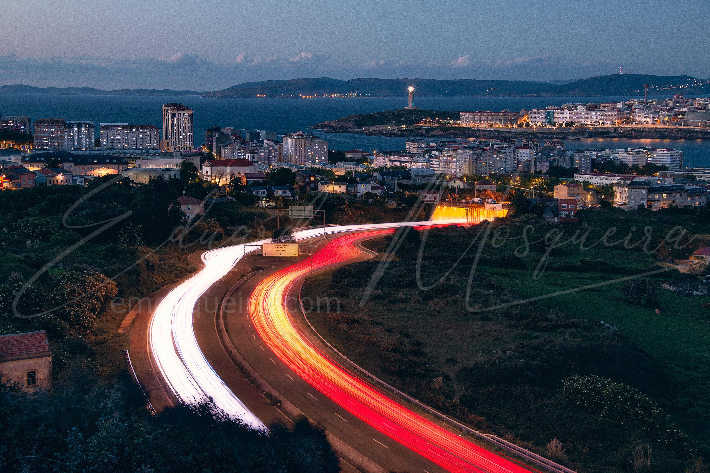Fotografía de Coruña durante la «hora azul» haciendo un montaje de varias fotos para conseguir capturar las estelas de los coches a lo largo de la Tercera Ronda de entrada a la ciudad. Tiene bastante trabajo de edición porque para que los carriles queden homogéneos hay que eliminar del montaje efectos raros (cambios de carril, intermitentes, etc.). También de los carriles he borrado un pequeño detalle que me parecía que molestaba bastante, no sé si alguien lo echa en falta…